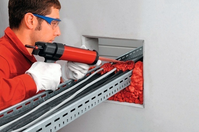 Основное назначение негорючих герметиков – отсечение огня в строительных технологических проемах, образованных при прокладке инженерных систем. Отверстия, которые остаются при монтаже внутреннего водопровода или кабельных разводок, создают пути для прохождения огня из одного помещения в другое.