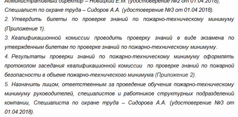 Организация пожарной безопасности на предприятии включает обучение персонала и его аттестацию. Экзаменационные вопросы должны касаться объема изученной программы. Зачет сдается комиссии учебного центра, которая проводила курсы по ПТМ, или специально созданной для аттестации работников в организации комиссии. Последняя составляется согласно распоряжению руководителя предприятия.