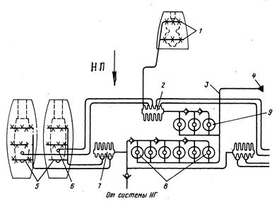 | Рис.9. Принципиальная схема ППС силовой установки самолета Ил-62: 1 – распределительные коллекторы отсека ВСУ; 2, 7 – блоки распределительных электрокранов; 3 – трубопровод для стравливания огнегасящего состава в атмосферу; 4 – устройство сигнализации о разрядке огнетушителей; 5 – распылительный коллектор отсека двигателя; 6 – устройство подачи огнегасящего состава внутрь двигателя; 8 – цилиндрический огнетушитель; 9 – шаровой огнетушитель |