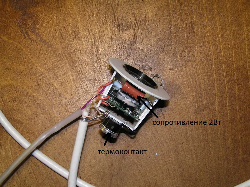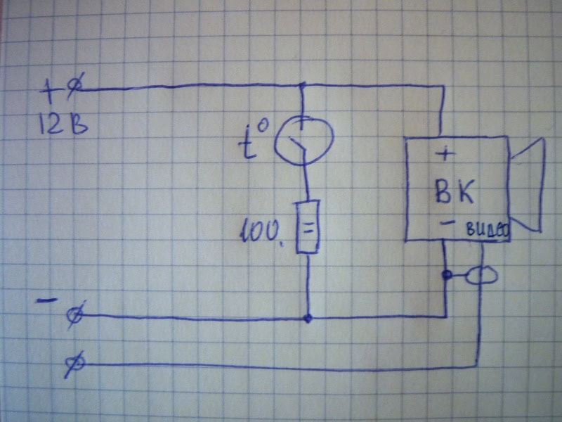 Опыт применения мною простых модулей показывает, что они нормально работают при температурах -10..15 С°, а если внутренний объем кожуха герметичен и содержит осушитель, то запотевания стекла не происходит. Но, все же для надежной работы неплохо предусмотреть небольшой обогрев. Подогрев осуществлен при помощи двух ватного сопротивления 100 Ом, подключаемого при помощи термоконтакта на размыкание при +10 С°. Читатели сайта предложили термоконтакт типа KSD-301 на +20 С°, я думаю лучше подойдет датчик в на +10 С°. Электрическая схема приведена на рисунке.