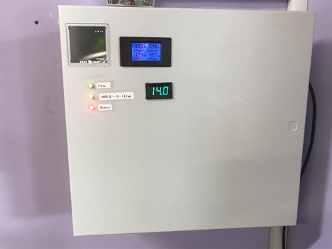 Кроме того, на передней крышке щита разместил дополнительную светодиодную индикацию цепей: сеть 220 в, состояние АКБ и наличие напряжения на нагрузке (зеленый, желтый и красный светодиоды). Ну, и конечно же, цифровой вольтметр, показывающий напряжение на клеммах АКБ. А также пристроил туда полезный китайский девайс, показывающий напряжение на нагрузке, потребляемый ток, мощность и даже потребленную электроэнергию в вт/ч. Последнее мне — фиолетово, но в целом решил, что остальное не помешает.