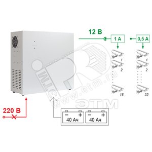 ИБП постоянного тока 12В Штиль PS1210G с номинальным током 10А и PS1220G с номинальным током 20А. Цены — 12 600 рублей и 15 000 рублей, гарантия — 2 года. Производитель приводит значение тока заряда — 3 А и рекомендуемые емкости встраиваемых АКБ — 7, 17, 26, 38 А•ч (информация с сайта производителя). На самом деле, при таком зарядном токе можно использовать и «более емкие» АКБ (и 65 А•ч, и 100). В шкаф ИБП они, по всей видимости, поместятся, поскольку на других сайтах приводится диапазон допустимых АКБ 17 . 100 А•ч. Для решения поставленной задачи PS1220G подходит.